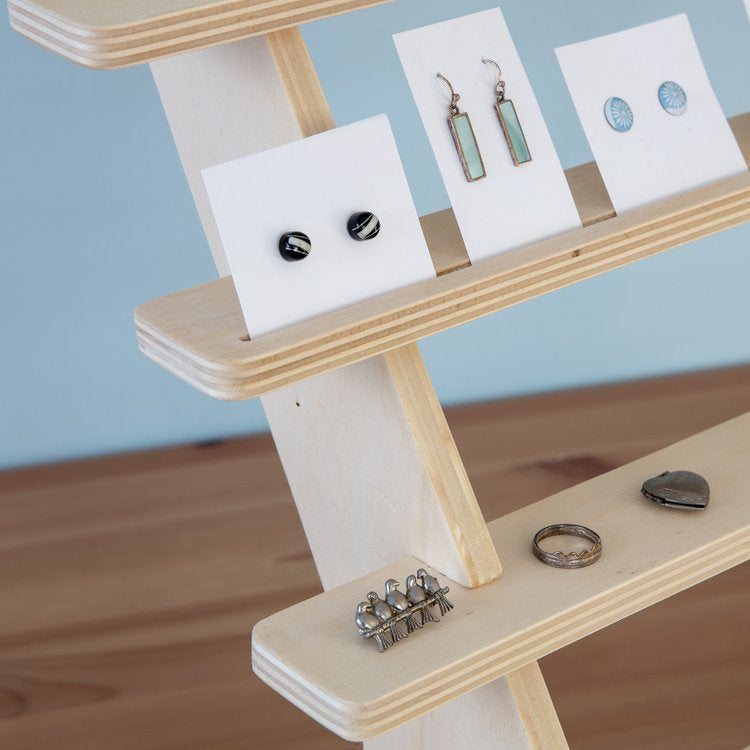 Reversible grooved shelves on our stands are ideal for displaying jewellery