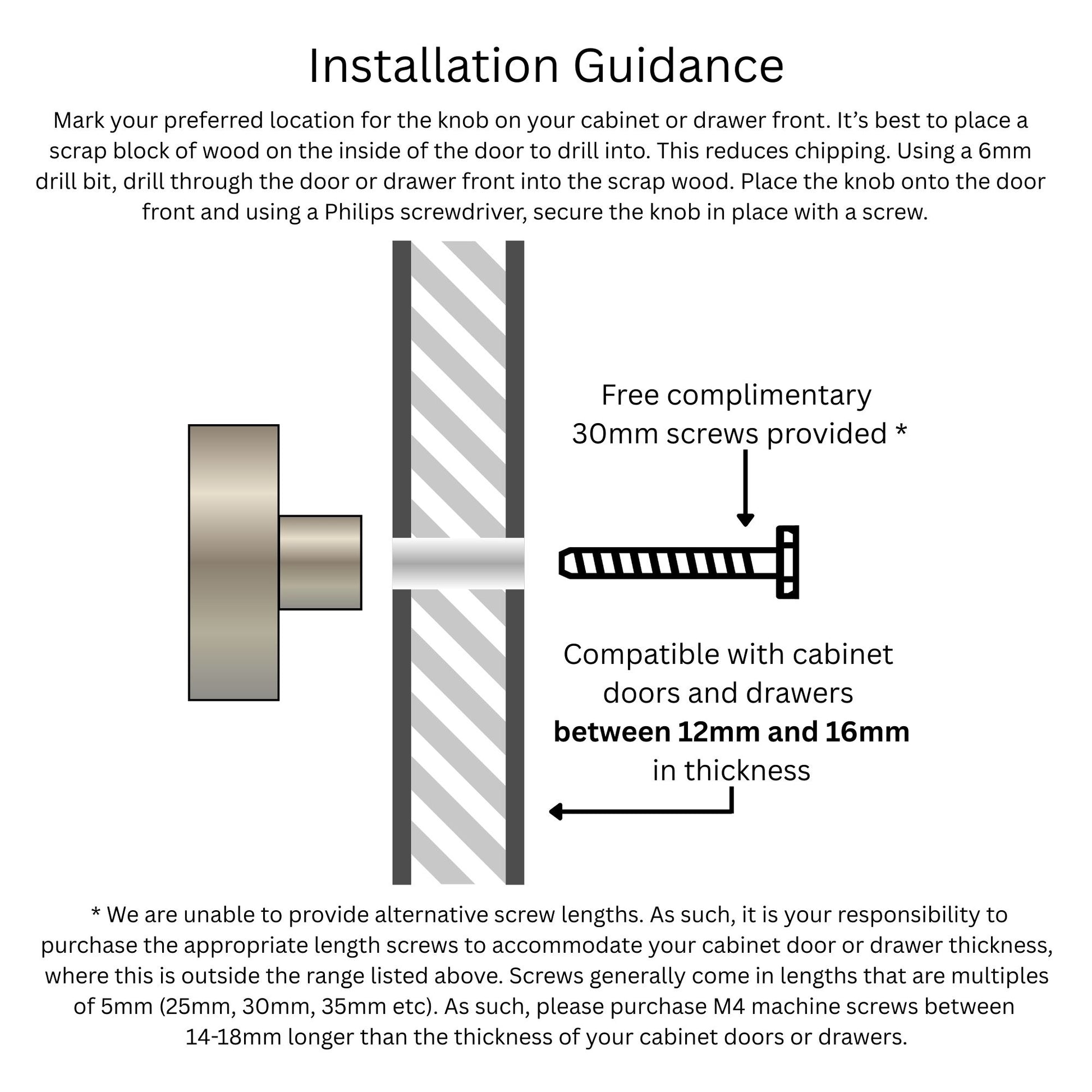 *Please note we provide free, complimentary 30mm screws with your purchase. These screws are designed for cabinet doors with a thickness between 12mm and 16mm. We do not provide alternative screw lengths and as such, it is your responsibility to procure the appropriate length screws to accommodate your cabinet door thickness where required.